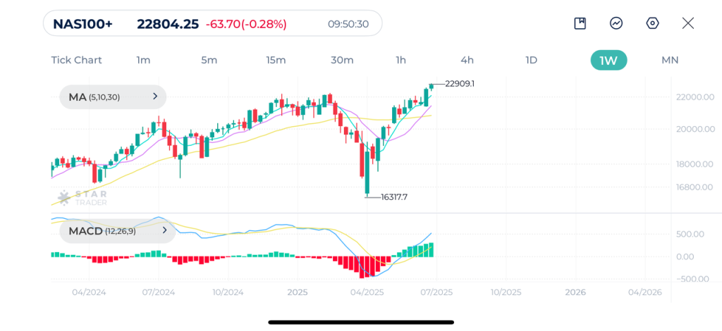 在贸易谈判取得进展的背景下,纳斯达克100指数与标普500指数双双创下历史新高。纳指上涨1.2%,收于22,892点;标普500指数则上涨1.4%,收报6,285点,受益于稳健的宏观经济数据以及科技股的持续热度。