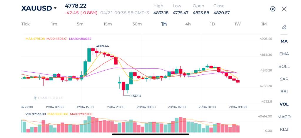 Vàng đang chịu áp lực trên khung 1 giờ sau khi không thể duy trì đà tăng trên vùng kháng cự $4,813–$4,820.Giá đã quay đầu giảm từ vùng phục hồi gần đây và hiện giao dịch quanh $4,778, nằm dưới tất cả các đường trung bình động ngắn hạn.Sự từ chối này cho thấy phe bán vẫn đang chiếm ưu thế sau nhịp tăng mạnh trước đó lên $4,889.