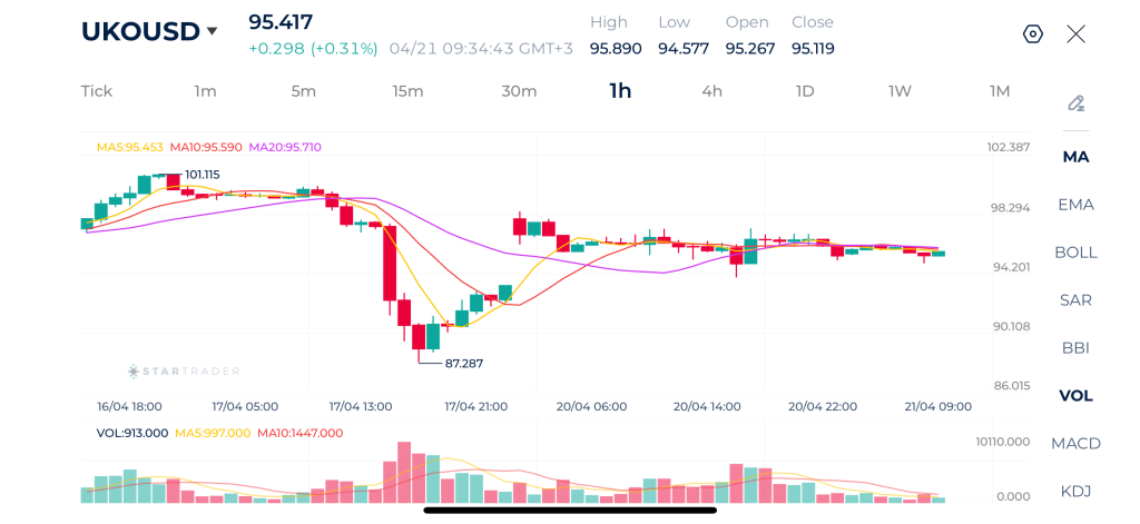 Giá dầu Brent đã ổn định sau khi giảm mạnh xuống $87.287 và phục hồi trở lại.Giá hiện đang giao dịch quanh $95.40, đi ngang trong biên độ hẹp khi thị trường hấp thụ biến động gần đây.Các đường trung bình động đang đi ngang và hội tụ gần nhau, phản ánh sự do dự và thiếu động lượng rõ ràng.