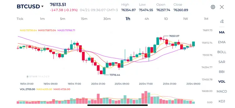 Bitcoin vẫn duy trì cấu trúc tích cực trên khung 1 giờ sau khi phục hồi mạnh từ đáy $73,716 và tạo đỉnh hồi mới gần $76,551.Giá hiện đang tích lũy quanh vùng $76,100 sau nhịp tăng vừa qua.Các đường trung bình động vẫn hỗ trợ xu hướng, khi giá giao dịch trên MA20, trong khi MA5 và MA10 đang hội tụ gần mức giá hiện tại.